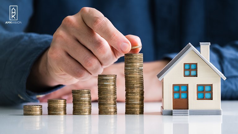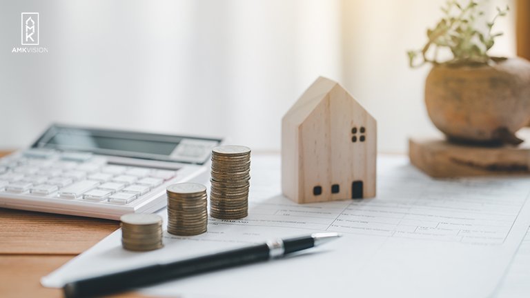 House placed on coins and calculator. Man’s hand driving in a stake. Concept for property ladder, mortgage, and real estate investment based on the saving of coins to purchase a house. You are saving for a home. Real estate